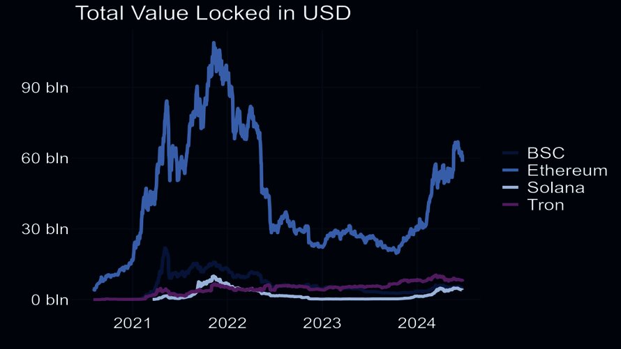 Chart 4: Das Volumen (in USD) an Kryptoassets die in DeFi-Protkollen verwendet werden ("Total-Value-Locked") ist auf Ethereum deutlich höher als auf allen anderen Smart Contract Plattformen. (Quelle: Defillama, eigene Kalkulation)